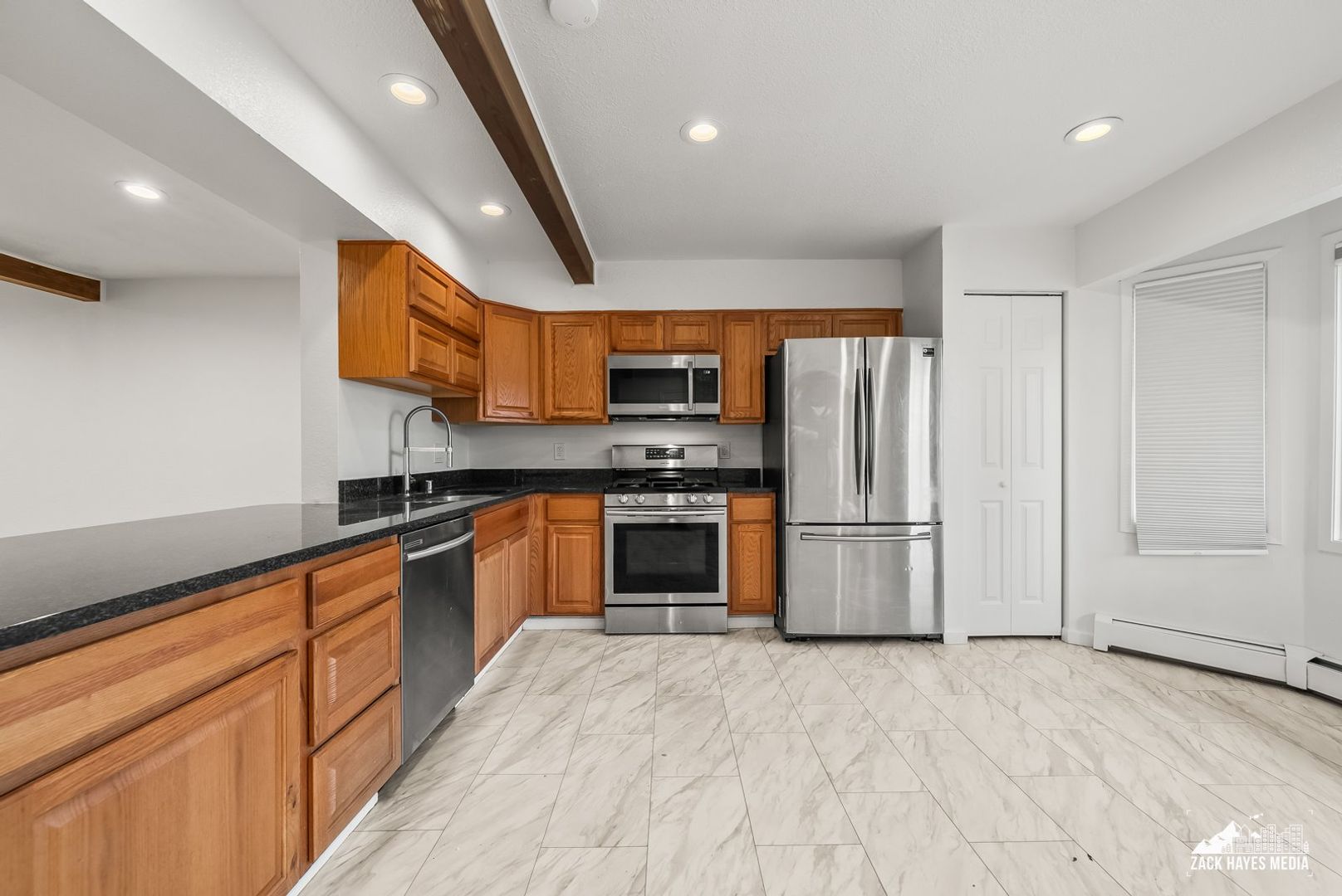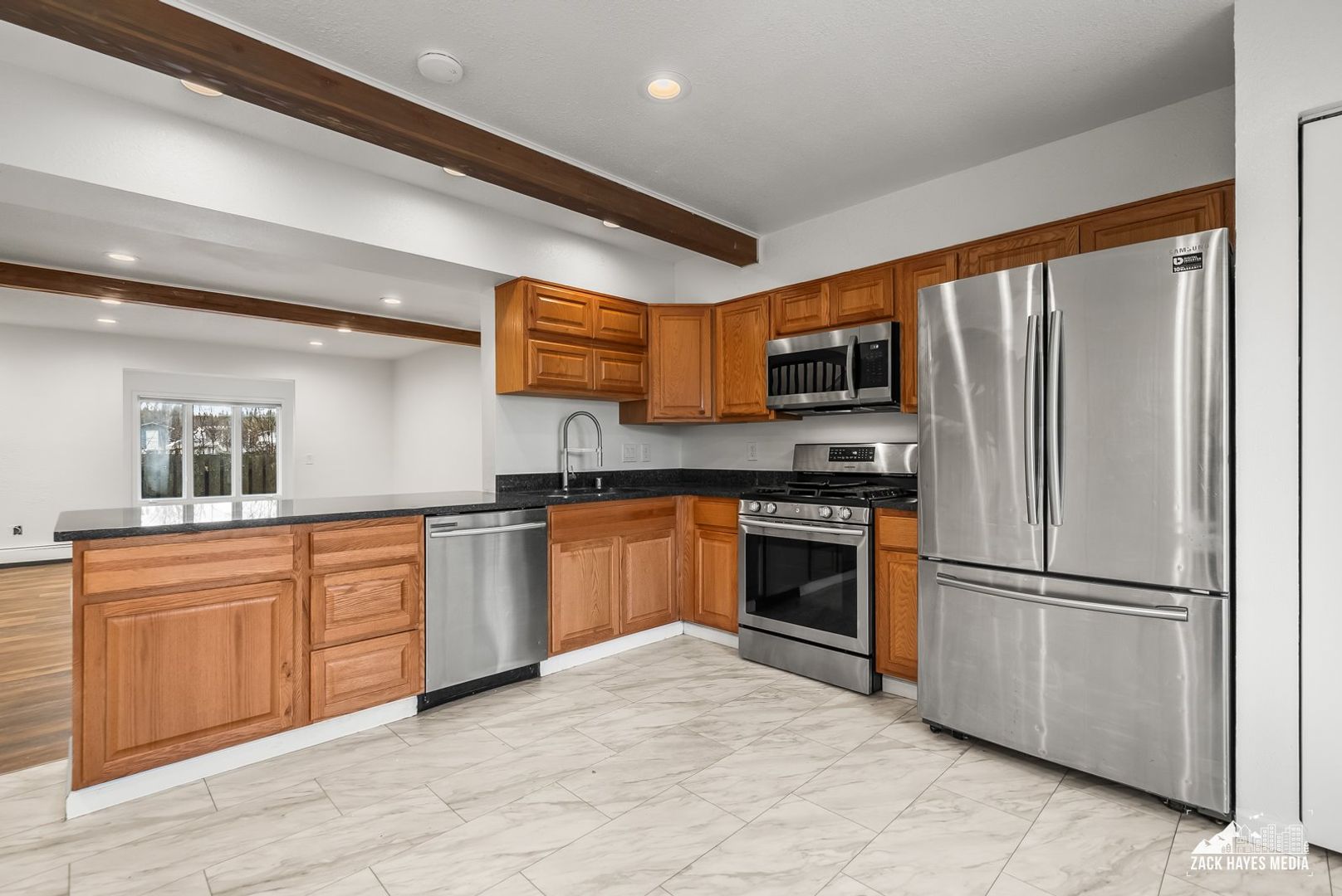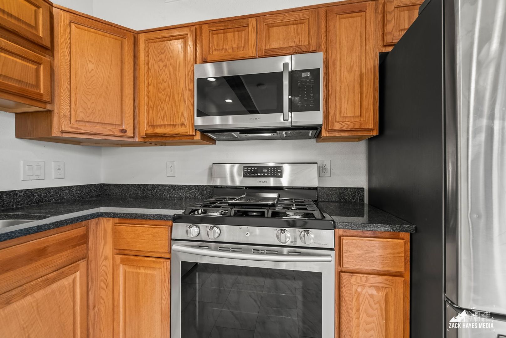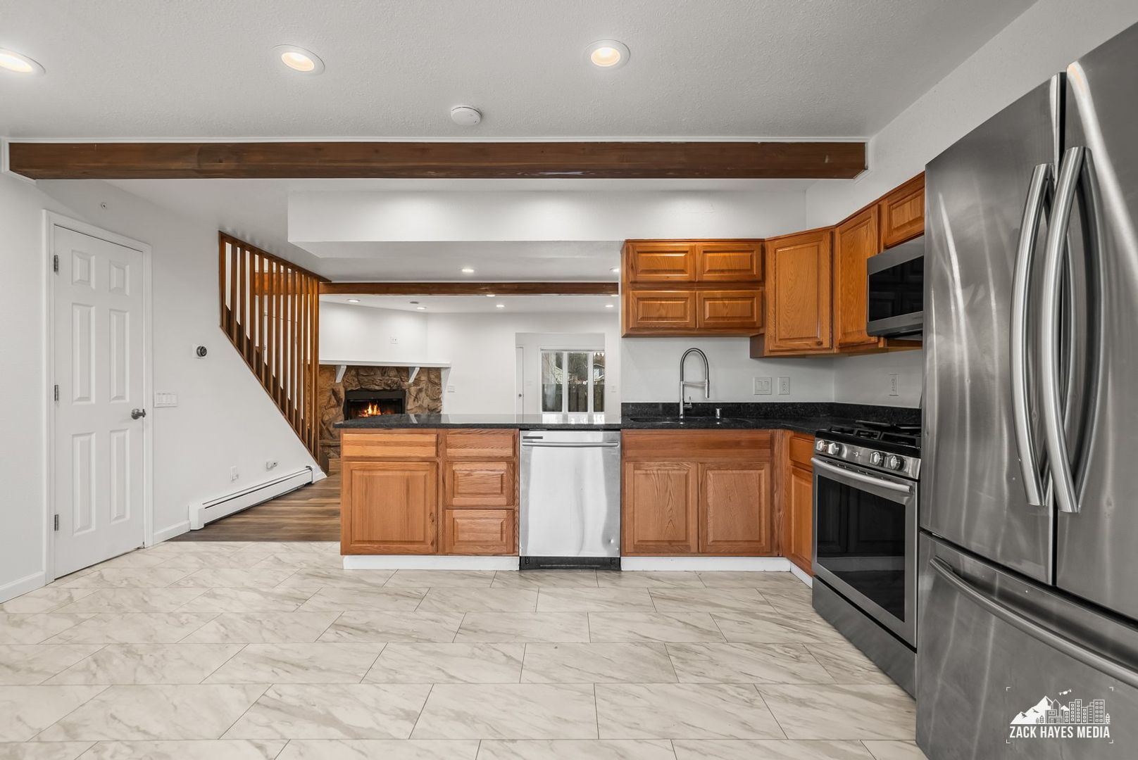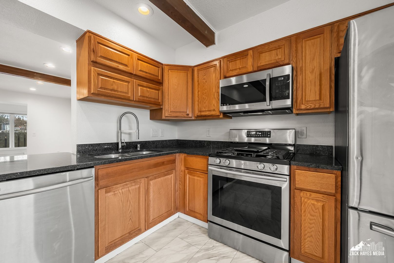 * Kitchen equipped with matching stainless steel appliances: microwave, gas stove, refrigerator, dishwasher.